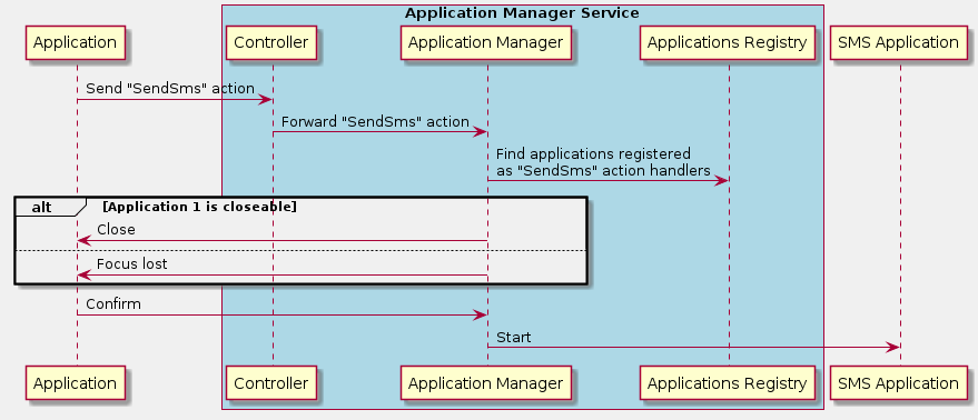 SendSMSDepending on the action's type, the Application Manager decides which application should handle it, based on the application's manifest. Thanks to that, Application Manager decouples applications.