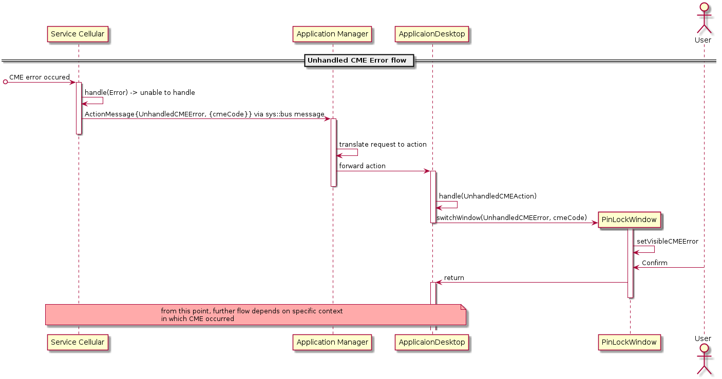 Service Cellular that is responsible for handling modem interactions in this contextApplicationsManager that is responsible for ApplicationDesktop management and reliable messaging in the Service->Application direction in this context.ApplicationDesktop that is responsible for PurePhone<->User interactions in this contextFollowing document focus mainly on (above listed) entities interactions and flow. Occasionally minimal interaction with other entities (such as User or modem) is outlined.